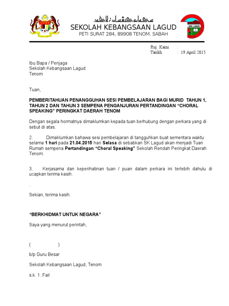 Untuk makluman, surat rasmi merupakan satu karangan yang ditulis mengikut format bagi surat kiriman rasmi tidak sama dengan surat kiriman tidak rasmi. Contoh surat rasmi di bawah adalah contoh surat yang betul. Untuk mendapatkan perhatian pihak yang terbabit, surat anda haruslah menarik perhatian dan berinformasi untuk membuatkan meraka ingin membacanya. Boleh rujuk laman web rasmi th untuk maklumat lanjut. Untuk makluman pihak tuan, ahli jawatankuasa persatuan kadet remaja sekolah telah merancang untuk. Carian contoh surat rasmi tidak hadir ke sekolah. Untuk memudahkan sesiapa yang perlu menulis surat kiriman rasmi. Pemberitahuan contoh surat rasmi makluman. Ia bukan saja penting pada peperikasaan upsr, pt3, spm atau stpm, tetapi juga sering digunakan pada hidupan anda. Untuk makluman tuan, pertandingan tersebut akan diadakan seperti berikut. Alamat anda sebagai pengirim 2. Untuk makluman saudara, pada minggu lepas sekolah saya telah mengadakan hari kantin. Soalan untuk makluman saudara, kempen ini diadakan dengan tujuan menyedarkan orang ramai supaya sentiasa menjaga kebersihan diri agar terhindar daripada virus tersebut.